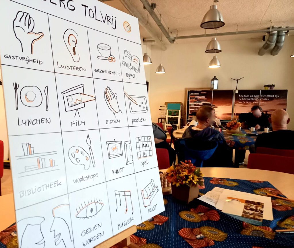 And so I drew 16 images of what Tolvrij stands for, like hospitality, contact, workshops, prayer and lunch.
